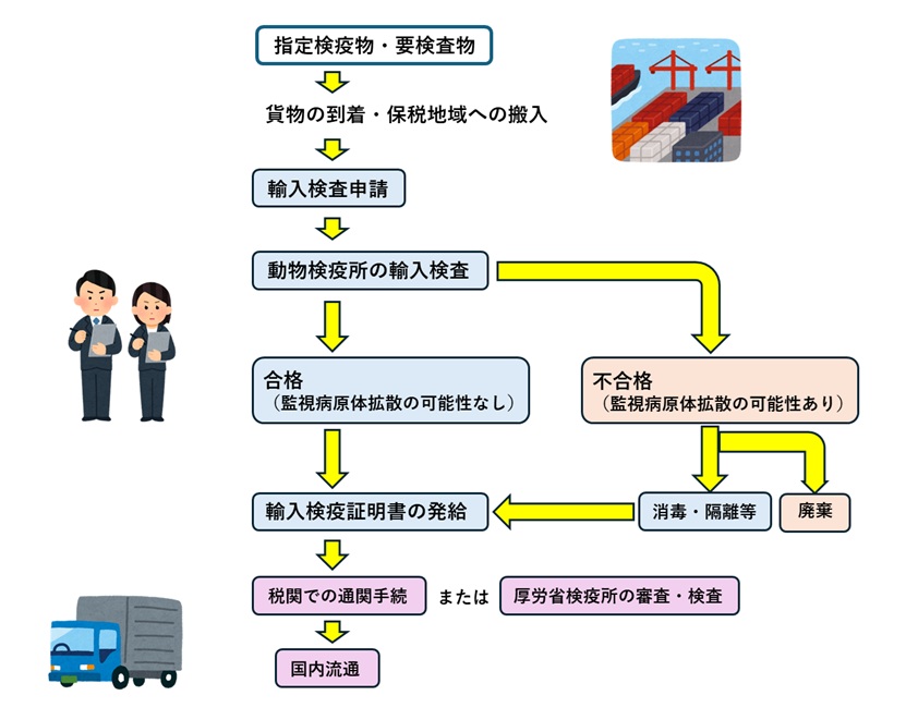 合格証明書を取得した輸入者は、検査合格した動物(性産品)が食品であれば、次に食品衛生法に基づく検査の受検に移り、それが食品でなければ、通関手続を行うことができます。